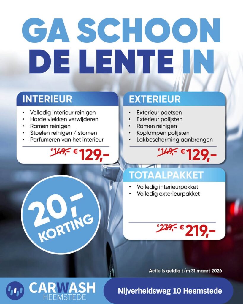 Dit is de periode om niet alleen het exterieur, maar ook uw interieur schoon te maken, omdat de felle lentezon elk stofje en iedere vlek op het dashboard, de ruiten en andere oppervlakken genadeloos zichtbaar maakt. Daarom geven wij enkel in maart โฌ๐ฎ๐ฌ ๐๐ข๐ฅ๐ง๐๐ก๐ op al onze poetspakketten.